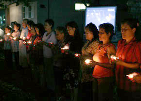 慈济志工于佳冬农校临时灾民收容中心举办爱洒人间活动,祈求天下无灾难。灾民手捧心灯,虔诚祈祷。