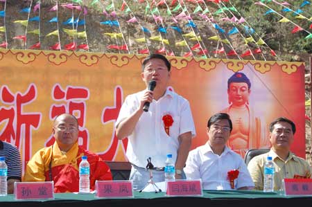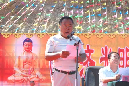 河北鸡鸣山集团董事长赵万仓介绍建塔情况。