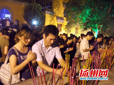 2009年8月9日(农历六月十九),观世音菩萨成道日,天还未亮,江苏省扬州市观音山上就已香客如潮,敬香的人们手持“三支香”或鲜花、鲜果,整个香会现场秩序井然,“文明、有序、安全、和诣、稳定”成为2009年香会最亮丽的风景。(文:高干、徐晓燕)