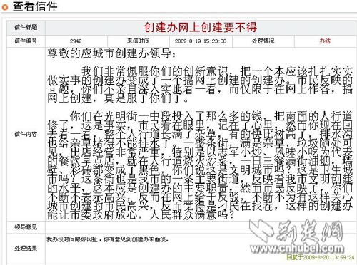 8月19日,湖北应城一市民向市长写信反映问题,20日,市长信箱回复说:“我办没时间跟你闲扯”。市长信箱网站截屏图