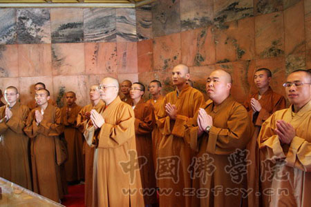 2009年9月15日上午,中国佛学院09级新生在教导主任理证法师和班主任智勇法师的带领下先前往北京灵光寺朝拜佛牙舍利。