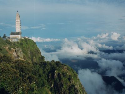 鸡足山,又名九曲岩,在云南省宾川县西北40km处。全山南北7.5km,东西15km,最高峰天柱峰海拔3220米。山势背西北而面东南。山形前舒三支,后伸一支,状若鸡足,故名。