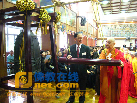 香港民政事务局局长曾德成先生与港佛联会长觉光长老鸣钟三响