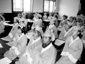 国学课每节40分钟,上课前,师生须起立面对孔子画像拱手行礼,然后是学生向老师行礼,老师紧接着给学生还礼。礼毕,师生继续席地而坐。