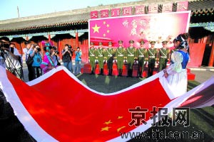 昨天下午4时许,这112名来自56个民族的青少年一出现在午门前,靓丽的服装和青春的气息就惹得游人驻足围观,当一面宽两米多的国旗十字绣亮相时,更是引来一阵狂拍,而国旗护卫队的战士们早就在营地前列队等候了。