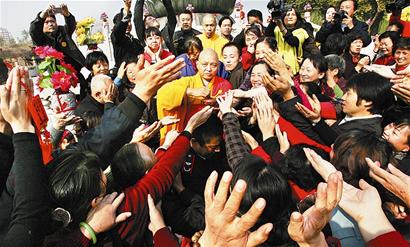 归元禅寺方丈隆印大师和本报副总编辑韦忠南分别代表活动主办方,在开幕式上致辞。隆印大师说,盛世祈福是中国传统文化的一项重要内容,历朝历代在国泰民安的年月,都有为民祈福的习俗。今年适逢新中国60年华诞,祖国欣欣向荣,人民安居乐业,此时举办大型祈福活动,可很好满足民众诉求。而佛教文化的精髓在于“善缘”二字,为信众提供祈福平台,传播美好善良的愿望,正是与人结缘的最好体现。韦忠南表示,佛学的“善缘”精髓与建设和谐社会的观点不谋而合,将宗教祈福活动推介给更多的人,具有正面积极的意义。