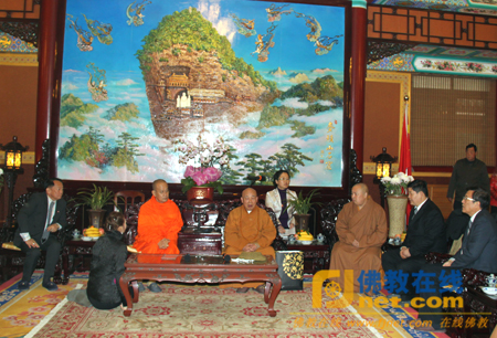2010年11月30日上午10点30分,泰国佛教协会会长帕·唐玛斯提那优长老,泰中佛教文化协会会长、众议院议员、副总理代表超瓦林·拉塔萨思里警中尉一行到位于北京广济寺内的中国佛教协会拜访,受到中国佛教协会会长传印长老的亲切会见。宾主双方在怀远堂进行了友好交流。