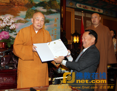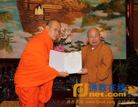 泰佛协会长帕·唐玛斯提那优长老向传印长老转交泰国僧王的贺函