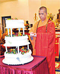 上午9时30分,护法会朱会长执香案迎请见灯法师入坛主法,并带领与会大众于佛前拈香。随后见灯法师为精舍十周年庆切糕祝愿。