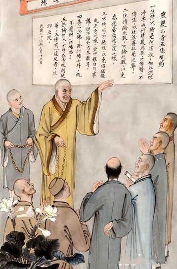 一九三七年大师应妙真和尚之请,移住灵岩创办十方专修净土道场,并制订了五条规约(一)住持不论是何宗派但以深信净土戒行精严为准只传贤不传法以杜法眷私属之弊,(二)住持论次数不论代数以免高德居庸德之后之嫌,(三)不传戒不讲经以免招摇扰乱正念之嫌堂中虽日日常讲但不招外方来听耳,(四)专一念佛除打佛七外概不应酬一切佛事,(五)无论何人不得在寺收剃徒弟五条,有一违反者立即出院,这五条规约是大师佛学思想的结晶,是兴净土振佛教的根本,是理想和实践相结合,实现理想化僧团组织的模式,也是近代佛教工作之纲领性文献,此后灵岩山寺就成了我国净土宗第二道场。