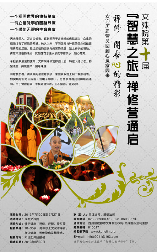2013年7月20日至27日,四川省成都市文殊院将举行第十届“智慧之旅”禅修营活动。