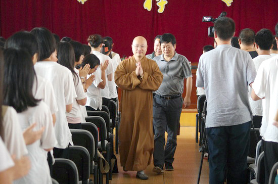 在始终微笑着专注地听完每一位代表的发言后,明基大和尚说,“表面上看好像是寺院在为大家服务,但其实同学们也在教育着我们,让我们深受触动和提升。”明基大和尚殷切叮嘱说,七天的夏令营,相信每一位同修都有自己的收获,关键是离开寺院后,如何让这种充满正能量的状态延续?他提醒大家一定要勇猛精进,在生活中修行,在修行中生活,要给自己制订学习和修行计划,尤其是每天早晚都要有定课,“如果没有早晚定课、集体共修及自修,连出家人也很难转化贪嗔痴的习气,何况大家呢?”