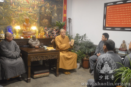 在方丈室,少林文化体验营一行受到了永信法师的热情接待。永信法师表示,少林文化是中国文化中一颗璀璨的明珠,这颗明珠不仅属于少林寺,属于佛教,属于整个中华民族,更是属于全人类。希望在大家的精心护持和传扬下,以禅武医艺为代表的少林文化能够焕发生机,更好地为社会服务,为人类服务,“去年,少林寺推出了都市禅堂,就是看到了都市人在生活和工作中所面临的一系列问题,我们希望运用禅的智慧去化解人们心中的烦恼,能够用佛法的慈悲来感化人心,并融入生活,最终走向解脱之路。”