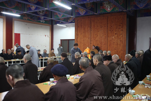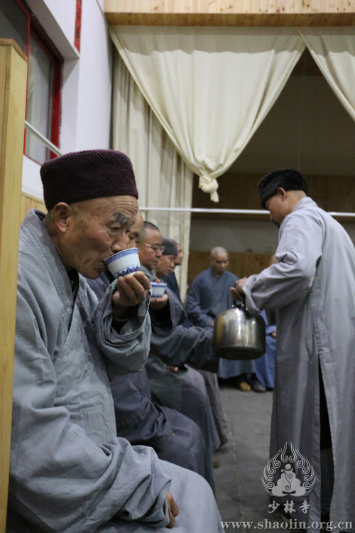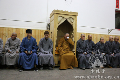 随后,永信方丈与众位禅和子到少林寺禅堂,一起吃普茶。期间,隆中法师向大众讲解了吃普茶的缘起与意义。延榕法师向大众宣读了《金山规约》,希望大众如法修行,勇猛精进。