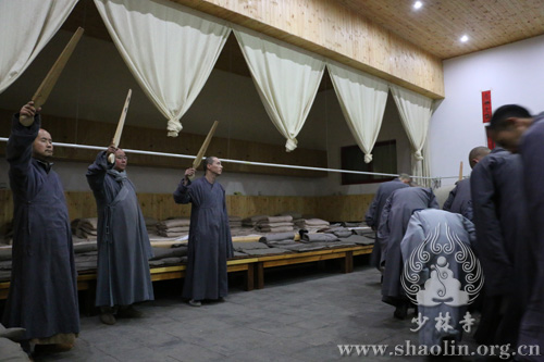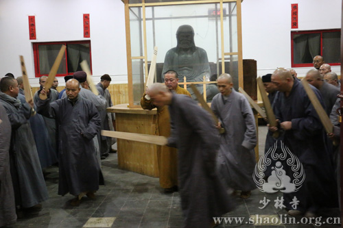 永信方丈进入禅堂后手执香板,偈曰:“十方同聚会,个个学无为,此是选佛场,心空及第归。”随后,永信方丈喊一声“起”,众禅和子绕达摩祖师像跑香起念。最后,众法师安坐于禅座,正式开始坐香。