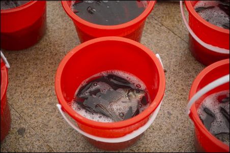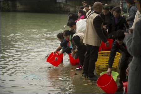放生开始了,大家用塑料桶把被放生的生命轻轻放入河中