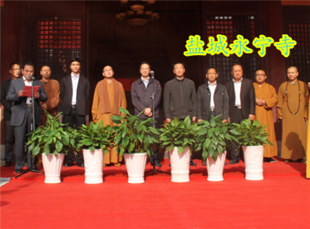 江苏省佛教协会副会长、盐城市佛教协会会长、射阳息心寺方丈了尘法师,江苏省佛教协会副秘书长、盐城市佛教协会副会长兼秘书长、盐城永宁寺方丈仁风法师,盐城市佛教协会副会长、阜宁县佛教协会会长、阜宁县盘龙寺方丈衍力法师,盐城市佛教协会副会长、江苏永宁实业投资有限公司董事长卞绍春居士,阜宁宝林寺、建湖九华开山寺监院妙庆法师,江阴市飞锡寺住持仁雨法师,盐城市佛教协会副会长、建湖县佛教协会会长刘汉雄居士等大德高僧、佛教界著名人士参加揭幕仪式,江苏省盐城市委统战部副部长、民宗局局长嵇绍乾先生等建湖县、阜宁县委统战部民宗局相关领导和永宁寺护法居士、四众弟子500余人出席揭幕仪式。