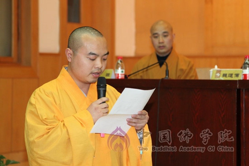 随后,来浩法师代表全院学生致祝贺词,可潜法师代表新入学的博士研究生致答谢词。