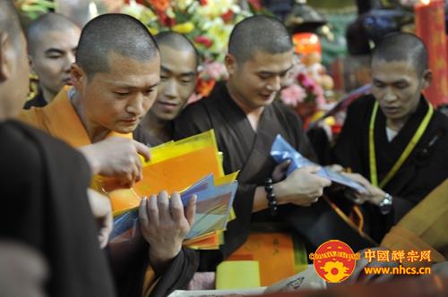 恭送三师回寮后,开堂传昌法师和陪堂敷净法师次第开示,众引礼法师分发戒牒,接到戒牒的新戒们无不欢喜感恩,然后虔诚礼佛、谢师。下午戒子们陆续出堂。