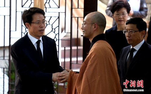 2014年11月21日,香港佛教联合会会长觉光长老圆寂舍报,“觉光长老圆寂追思赞颂仪典”在香港观宗寺举行,中央驻港联络办主任张晓明亲临吊唁。(张宇 摄)