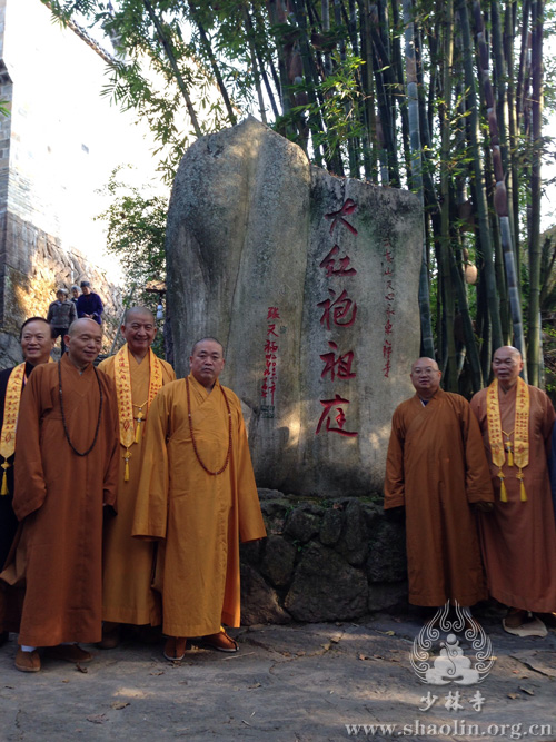 永信方丈一行在“大红袍祖庭”巨石前合影