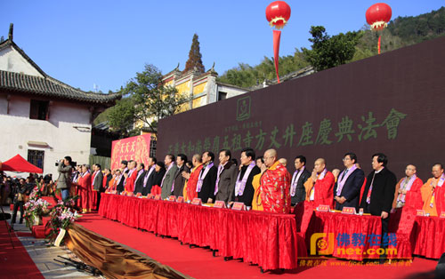 上午9点30分,庆典仪式在五祖寺广场隆重举行。仪式由中国佛教协会副会长明生法师主持。中佛协驻会副会长学诚法师宣读了中佛协贺电,湖北省政协副主席肖旭明宣读了湖北省委书记李鸿忠发来的贺信,中佛协会长传印长老赠送了墨宝,韩中佛教文化交流协会会长影谭法师送墨宝,中佛协赠送了礼品,黄梅县委书记余建堂、黄冈市委书记刘雪荣、日本妙心寺灵云院院主则竹秀南长老、中佛协副会长圣辉法师、中国社会科学院荣誉学部委员杨曾文教授、省中华文化促进会主席熊召政、省鄂旅投董事长马清明、省人大副主任赵斌、国宗局巡视员裴飚等领导嘉宾先后致辞,共同表达了:黄梅五祖寺以“天下祖庭”、“天下禅林”之盛名,饮誉海内外。并期待五祖寺在正慈法师的带领下,爱国爱教,学修并进,弘法利生,光大祖庭,为实现中华民族伟大复兴的“中国梦”贡献更大力量。