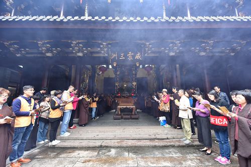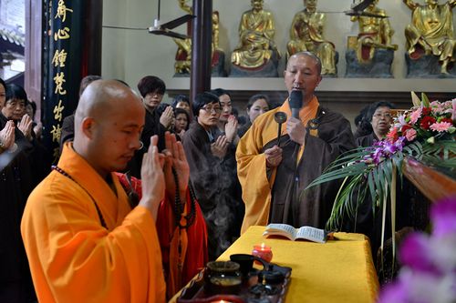 上午9:15,温州妙果寺放生法会在天王殿举行,在妙果寺知客则庄法师和常住师父们的带领下,各位善信一起为即将放生的有情生命忏悔业障、传授三皈依、发四宏誓愿、称佛名号,梵音清幽,让众生都能感受到佛法的慈悲普被。