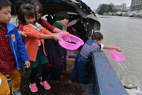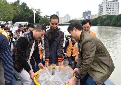 放生仪轨结束后,安福利生义工居士们前往放生的河边进行放生。此次被放生的物命主要有:鲫鱼、泥鳅、甲鱼、螺蛳等。当这些水族的有情被装载上船驶向河中央时,船上放生的义工居士们也和它们一起感受到了强烈的回家的喜悦,祈愿它们都能够皈依三宝,离苦得乐。