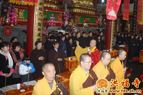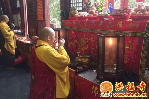2016年3月19日上午7时,上海洪福寺隆重举行华严法会之斋天法事,寺院全体法师齐集大雄宝殿,现场法号声声,梵音袅袅,场面庄严、清净而隆重,各式殊胜供品铺设齐全。
