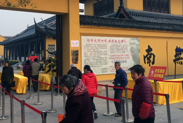 本次观音香期,本寺正式开始实行“文明敬香”,禁燃把香、高香,凡来寺信众免费赠送三支清香。礼敬佛菩萨贵在发心,不应以香的大小高低来衡量区分。在本寺的前期宣传和今天全体法师、义工的有序引导下,文明敬香开展顺利。寺内少了烟熏火燎,增添了清净祥和的氛围。