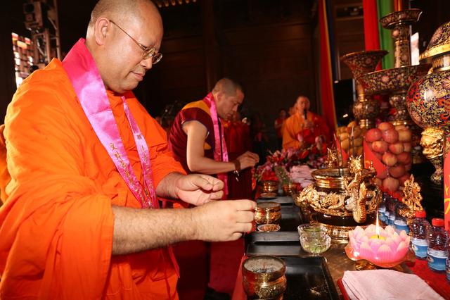 随后,举行了新文殊殿文殊菩萨圣像开光法会。法会礼请佛教界三大语系的大法师:全国政协委员、中国佛教协会副会长、上海玉佛禅寺方丈觉醒大和尚;中国佛教协会副会长、北京市佛教协会会长、北京雍和宫住持胡雪峰大喇嘛、泰国摩诃朱拉隆功大学副校长沙威·乔迪克大法师共同主法。数万名信众共同见证了这一庄严殊胜的重要时刻。