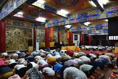 上午9点,共修正式开始。青年佛学会不同年级的学员集聚到文殊阁,在胜安法师和通迪法师的带领下,随着忏悔文的读诵,佛陀名号一个个出现,众人收摄身心,一句一拜,用“恭敬心、清净心、虔诚心”,发至内心的忏悔业障。拜后,大众齐声诵读了《地藏菩萨本愿功德经》,体悟地藏王菩萨大愿大悲的精神,护持道场,弘扬佛法。