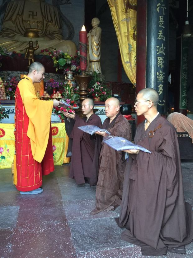 2016年农历7月16日,安徽天柱山三祖禅寺,一年一度的夏季安居圆满结束,并举行了自恣、解夏仪式。宽容住持一一向众僧授了功德衣,并祝贺僧众法腊又增长了一岁,各位法师欢喜不尽。