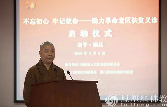 全国人大代表、中国佛教协会副会长、厦门市佛教协会会长、厦门南普陀寺慈善会会长则悟大和尚在启动仪式上表示,本次“不忘初心·牢记使命”扶贫义诊活动,是厦门南普陀寺慈善会今年对全省23个扶贫开发重点县进行“红色义诊”与扶贫慈善的第二站。则悟大和尚指出,革命老区人民在历史上为我国革命事业和社会事业的发展与建设做出了巨大的牺牲和贡献,我们要铭记在心,更要以实际行动帮助老区人民在全面建成小康社会进程中一个都不掉队。则悟大和尚表示,对佛教来说,饮水思源、知恩报恩也是佛教教理的重要内容,是中国佛教关注社会、服务人民的优良传统。开展以义诊施药、扶贫慰问为内容在全省革命老区开展“不忘初心牢记使命”的主题活动,是为了传承佛教慈悲济世的优良传统,发挥佛教慈善的优势与作用。则悟大和尚告诉大家,本次活动结合南普陀寺慈善会的特点,为全省23个扶贫开发重点县的老区人民带去物质和身心的关爱,在全省脱贫奔小康的攻坚战中,供奉我们一份至虔之心。