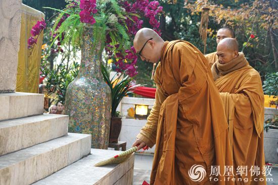 三门多宝讲寺住持宗振法师扫塔(图片来源:凤凰网佛教 摄影:多宝讲寺)