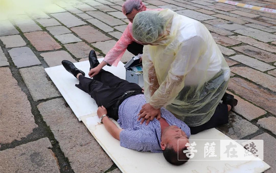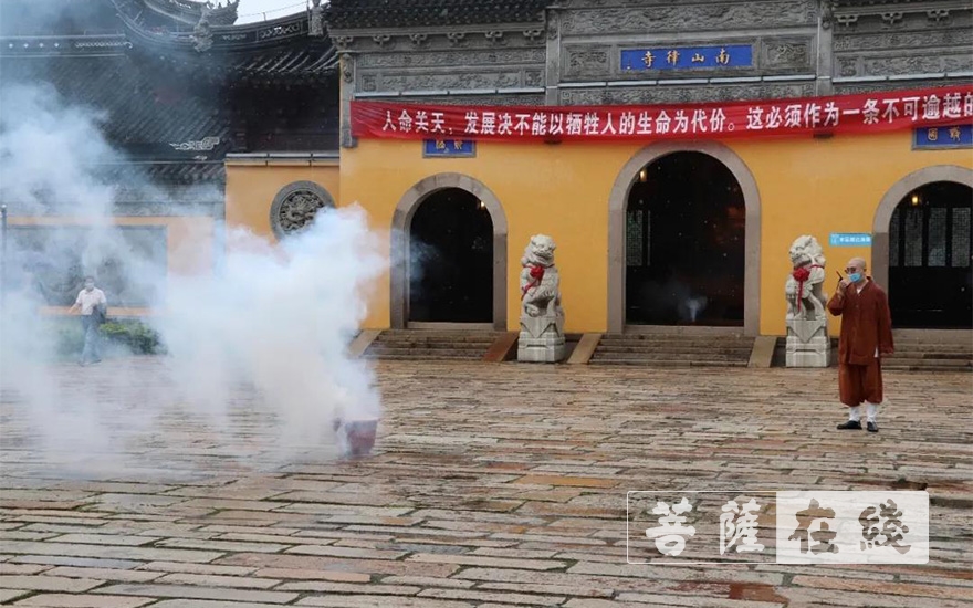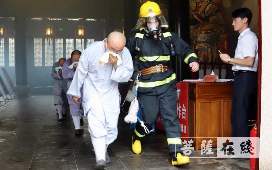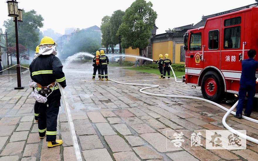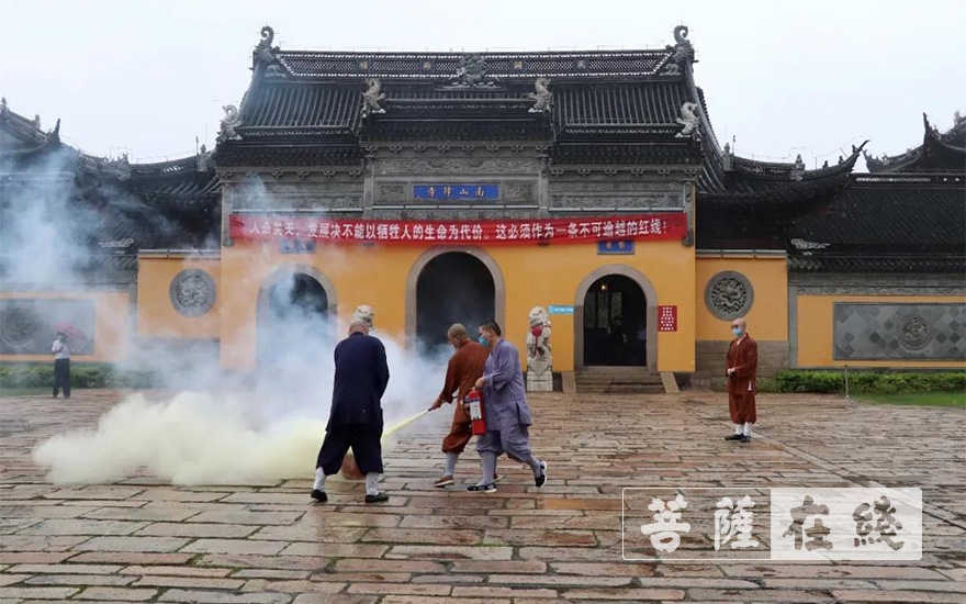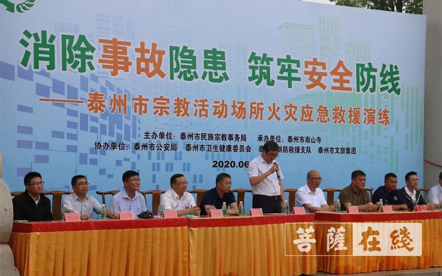菩萨在线江苏讯 为了提高和加强宗教活动场所安全意识和应急能力,贯彻“消除事故隐患,筑牢安全防线”的安全方针,提高寺院常住法师、护法居士的安全意识、消防知识、火灾扑救、逃生自救、急救及在突发事件的应变能力,6月23日上午,泰州宗教活动场所消防应急救援演习活动在南山律寺举行。泰州市公安、应急、卫健委、文广旅、消防等有关部门领导和基层民宗干部培训班全体学员现场观摩。