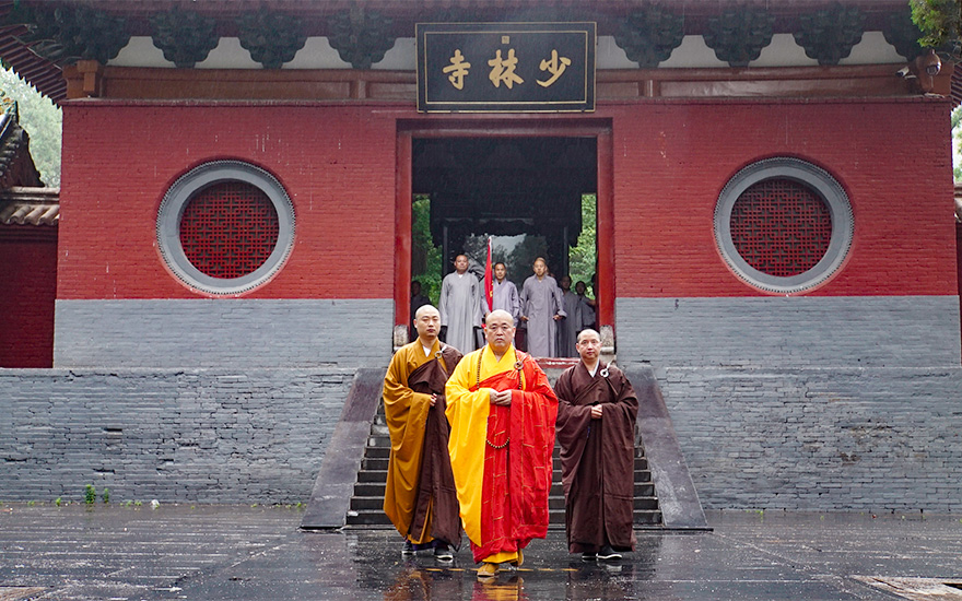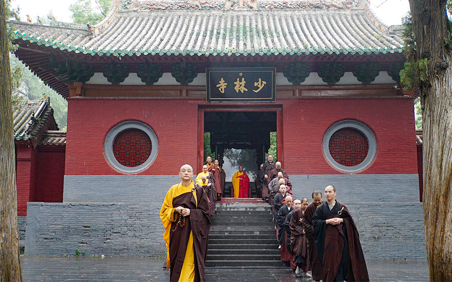 早上9时,少林寺山门缓缓打开,少林僧众在永信大和尚的带领下,排班而出,列队山门广场,举行庄严的升国旗仪式。