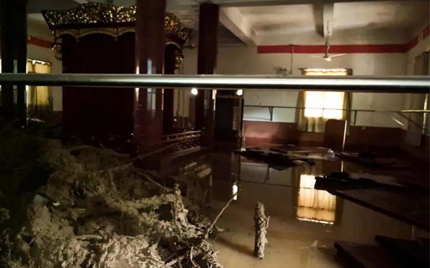 暴雨整整下了一天一夜,等到洪水退去,人们发现这座千年禅宗祖庭已经破败不堪。昔日僧人们坐香修行的禅堂,如今一片狼藉,原本庄严的塔院,被泥石流冲得七零八落,方丈室也被灌满了沙石、杂物……