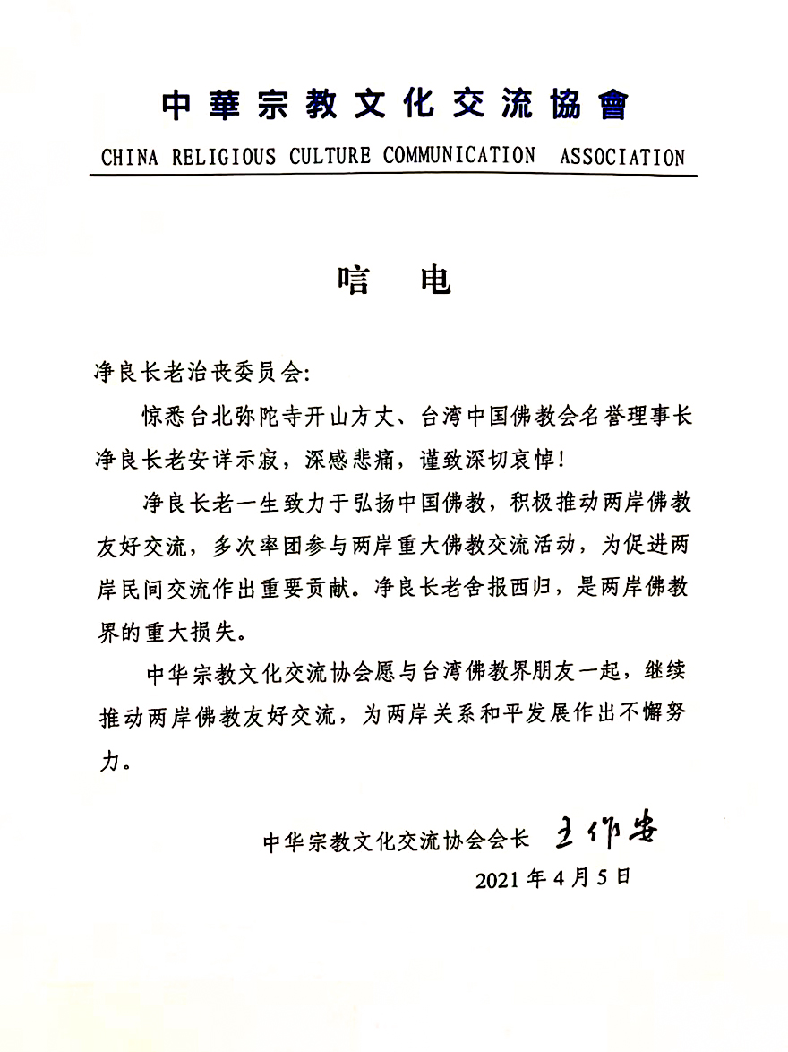得知长老往生,中华宗教文化交流协会特致唁电悼念净良长老,唁电全文如下: