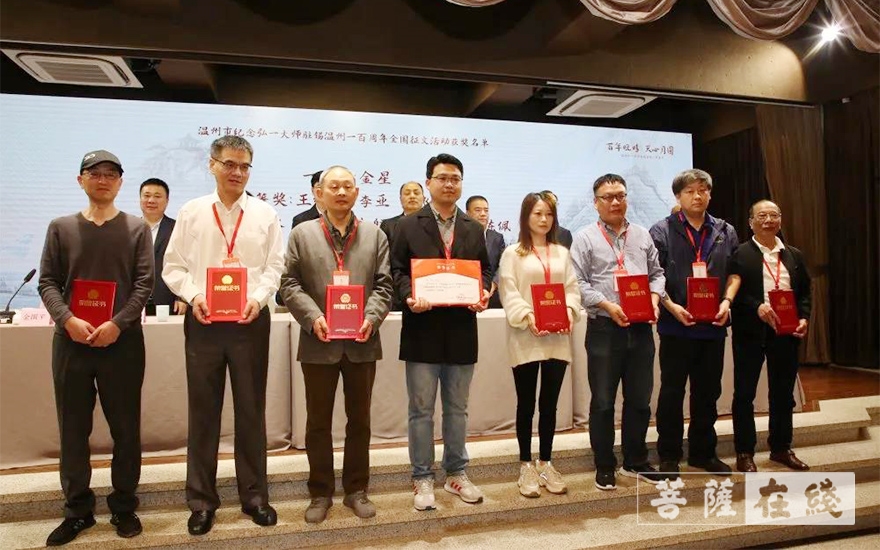 大会举行了纪念弘一大师驻锡温州一百周年全国诗词楹联、弘体书法、纪念文章、研究文章优秀作品的颁奖仪式,获奖代表上台领奖。