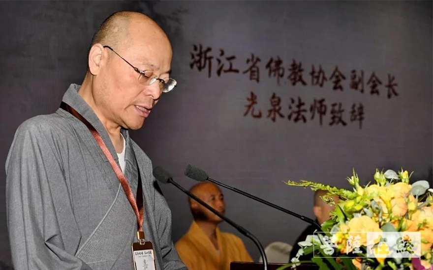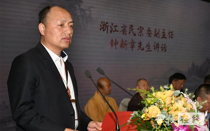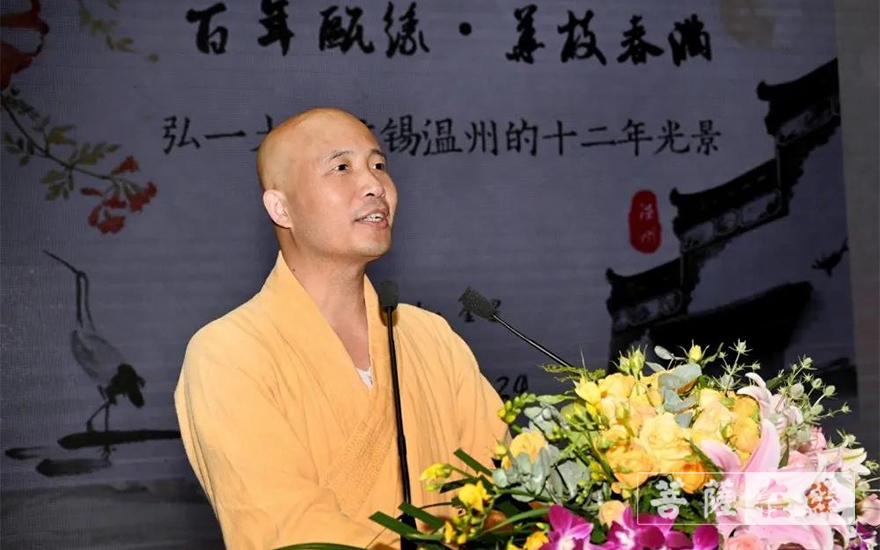 钟新章对活动的顺利举行表示热烈祝贺。钟新章指出,弘一大师是我国近代文艺先驱、教育家、著名爱国高僧、律学宗师,在诸多领域都取得了卓越成就,为后人留下了丰厚的精神文化遗产。近年来,温州佛教在温州市委统战部、温州市民宗局的正确引导下,发展迅速,在推进温州佛学院建设、加强僧才培养,深入开展讲经交流和巡讲活动,大力推广永嘉禅文化等方面,有效发挥了积极作用。要以举办此次纪念活动为契机,促进温州乃至浙江省佛教文化建设和精神弘扬,推动浙江佛教健康发展,为建设“重要窗口”贡献佛教界的智慧和力量。