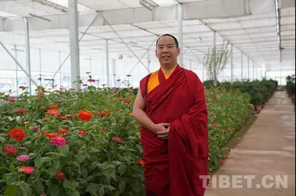 班禅在温室大棚鲜花前留影 摄影:王淑