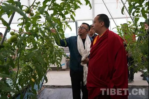 班禅走入蔬菜园、花卉园、热带植物园等温室园区,不时俯身仔细查看农作物长势。得知温室内竟种有百香果,班禅高兴地说道:“百香果可是热带植物,能在那曲海拔这么高的地方种出来,很不容易!”在蔬菜园,班禅打开种植挡板,听取无土栽培种植技术介绍,详细询问营养液喷洒时间、频率等情况,点头表示肯定。
