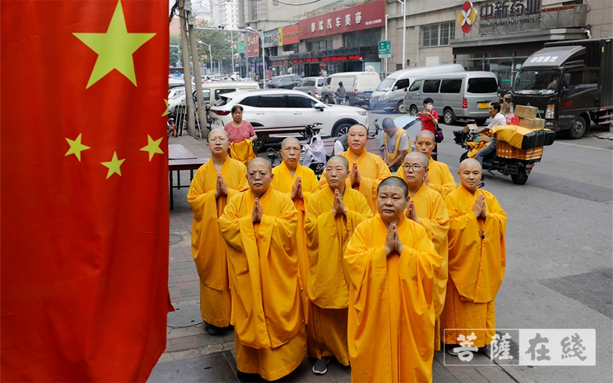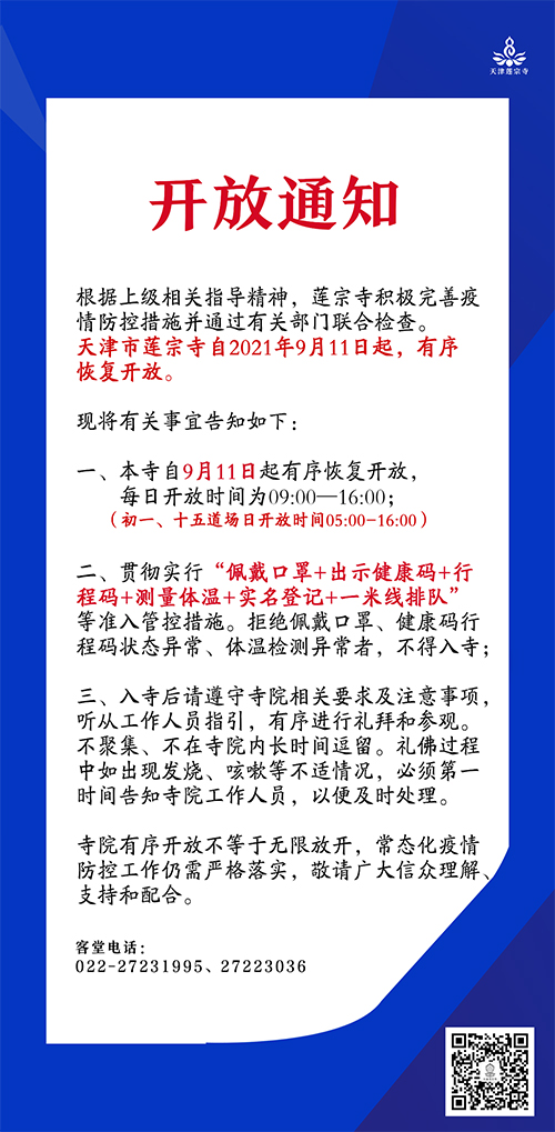 菩萨在线天津讯 随着疫情防控形势持续向好,天津市和周边省市疫情形势已经趋于平稳,根据上级有关通知精神,莲宗寺于2021年9月11日恢复开放,并于当日上午,举行“挂国旗奏国歌”仪式。