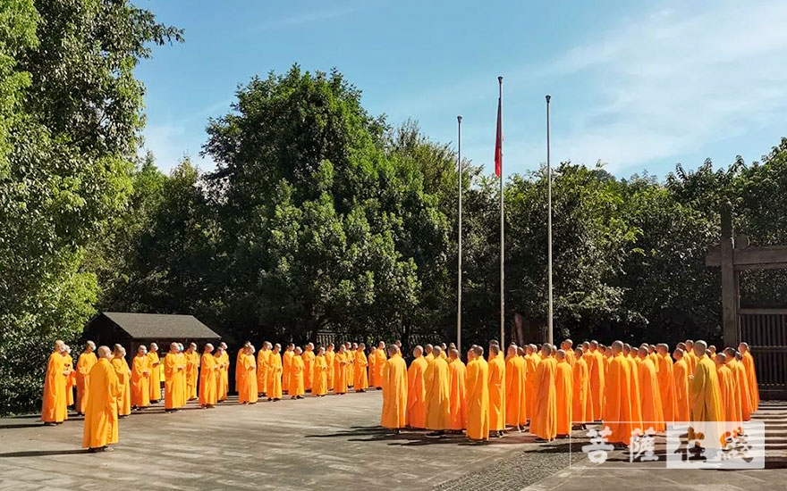 菩萨在线浙江讯 8月30日,杭州佛学院全体师生在前门广场举行升国旗仪式。升旗仪式结束后,在禅堂召开2021年秋季开学典礼。