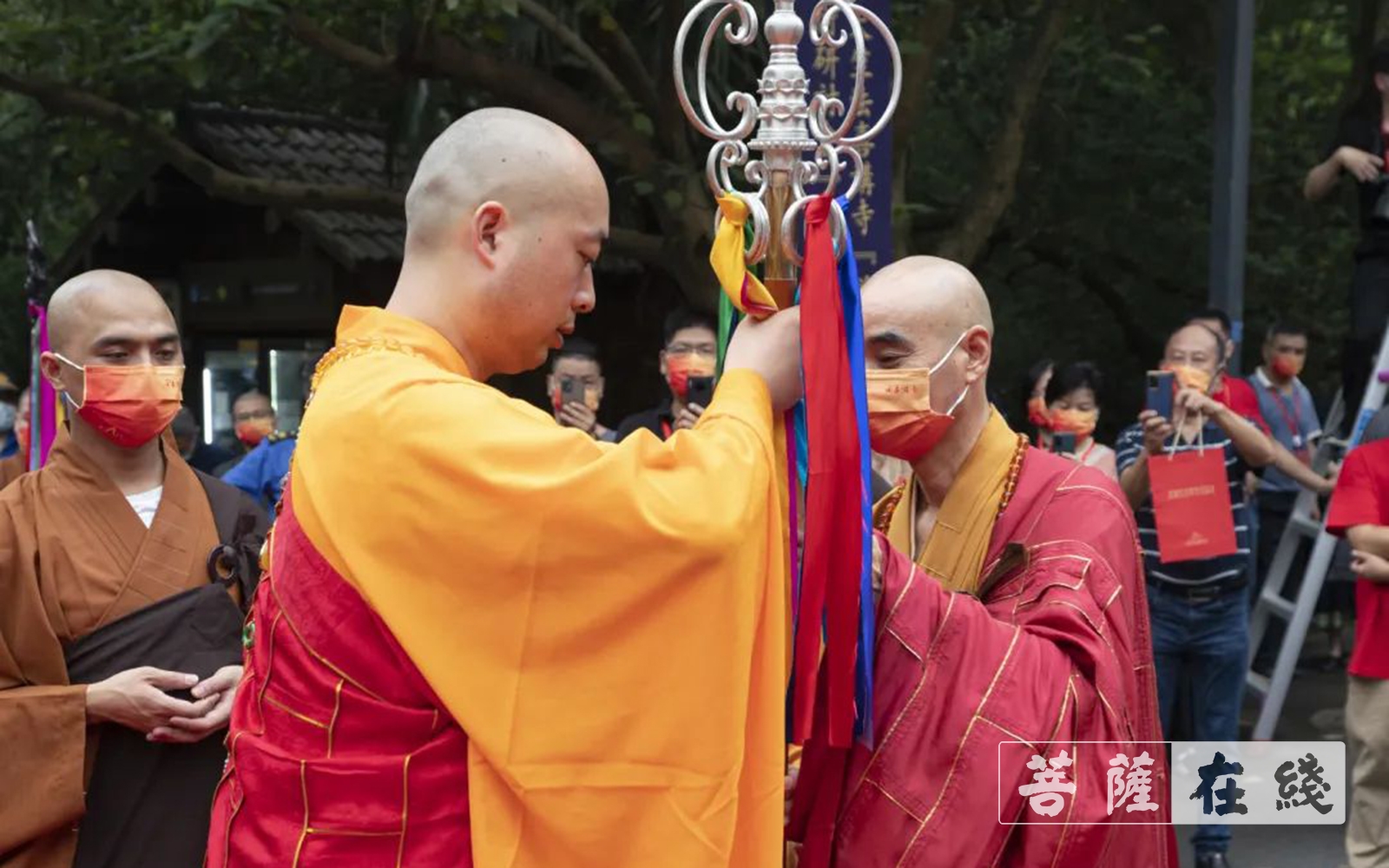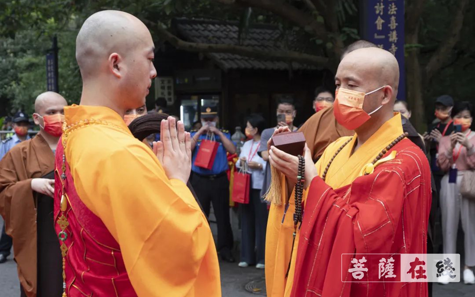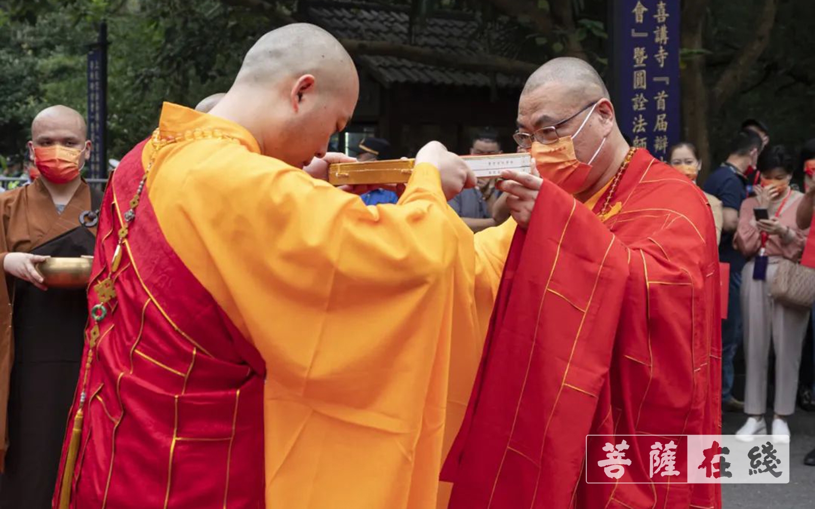 浙江省佛教协会副会长、杭州市佛教协会常务副会长、杭州韬光寺方丈月真法师为圆诠法师授法宝