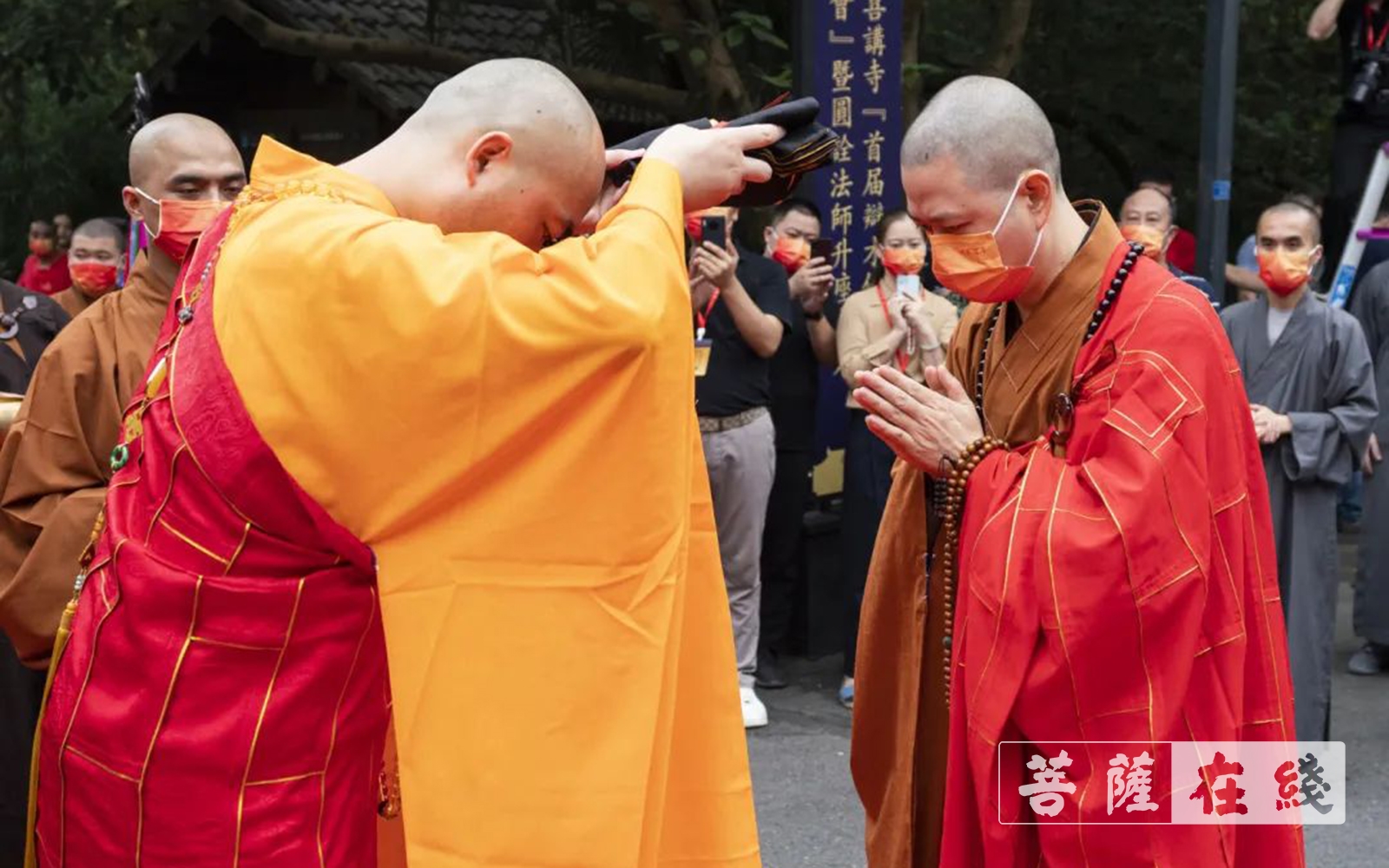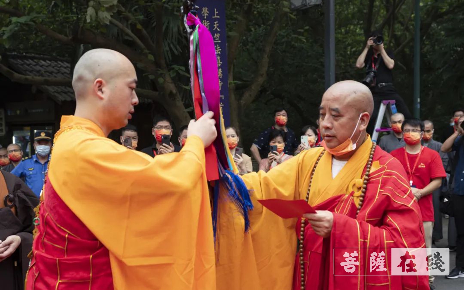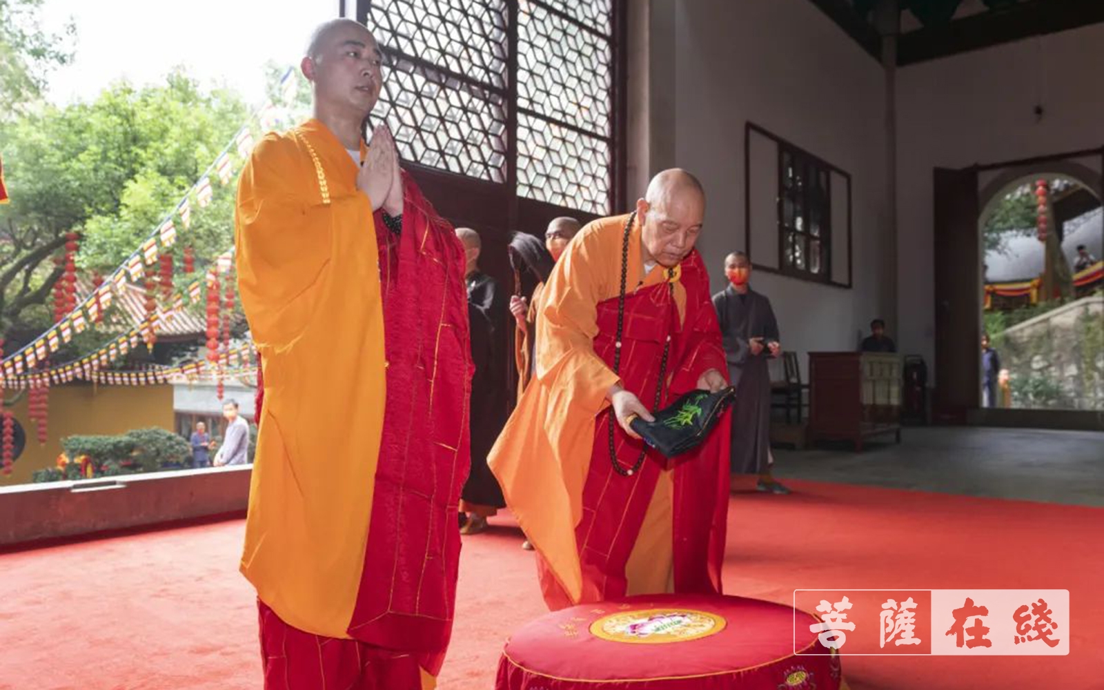 浙江省佛教协会副会长、杭州市佛教协会常务副会长、杭州韬光寺方丈月真法师为圆诠法师授法宝