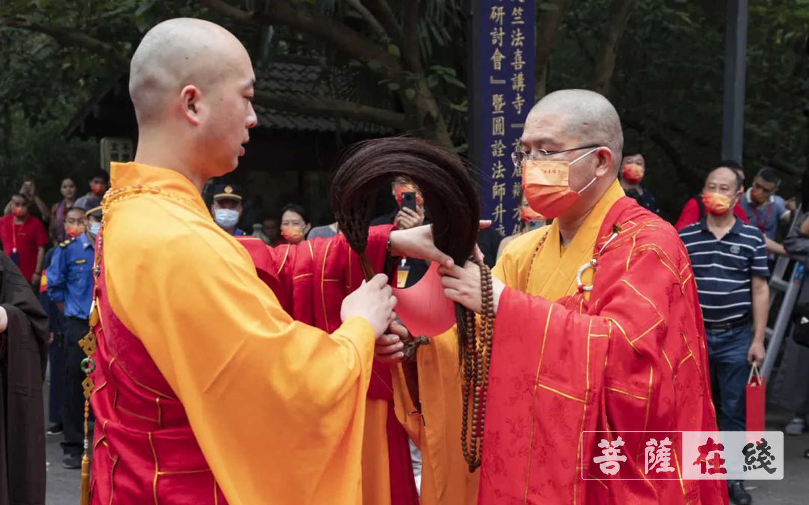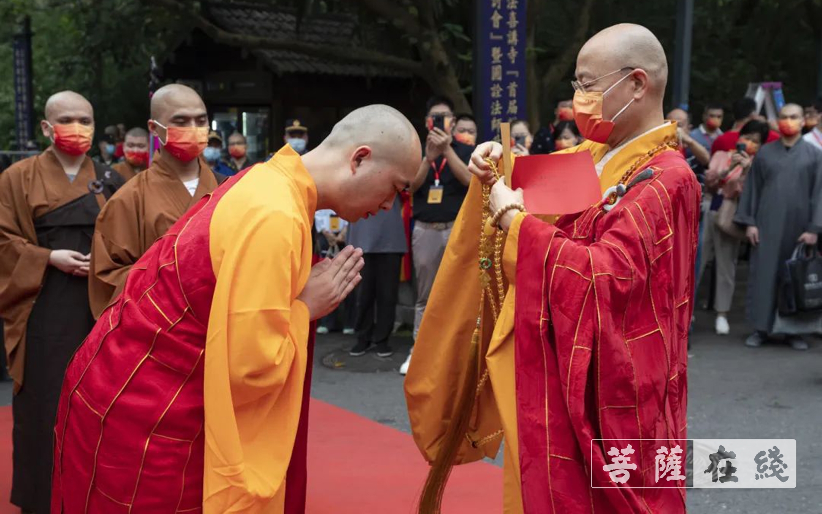 中国佛教协会副秘书长、 浙江省佛教协会副会长、 杭州市佛教协会会长、杭州灵隐寺方丈光泉法师为圆诠法师授挂珠