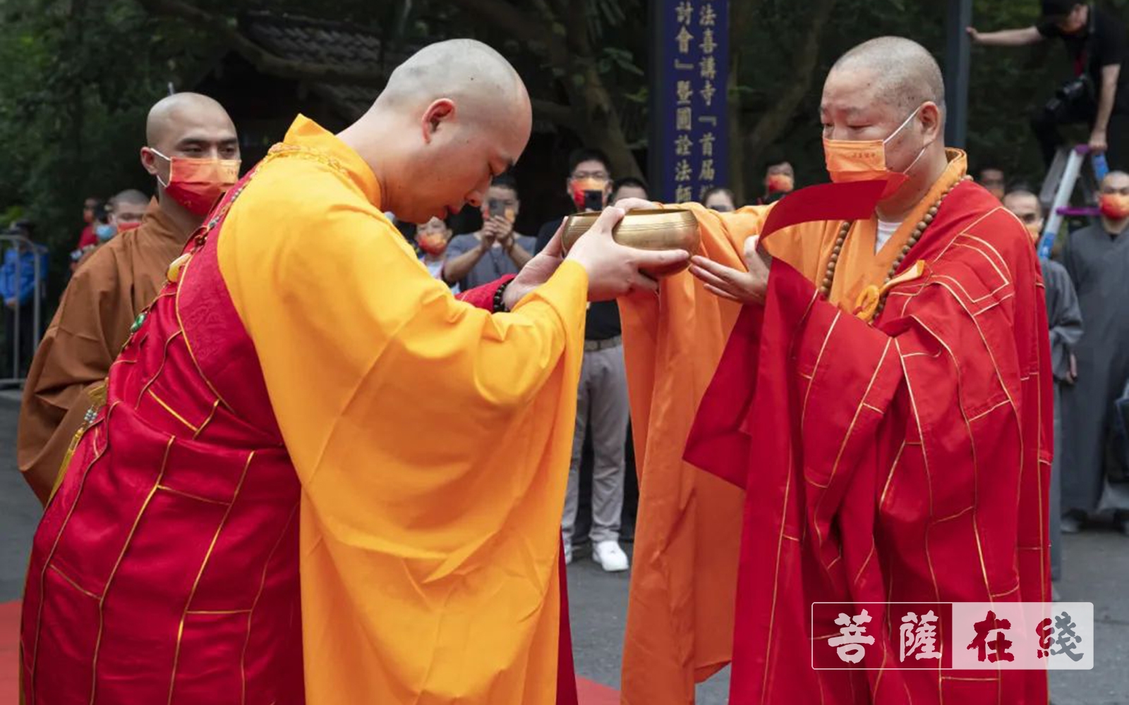 浙江省佛教协会副会长、天台山国清寺方丈允观法师为圆诠法师授钵盂