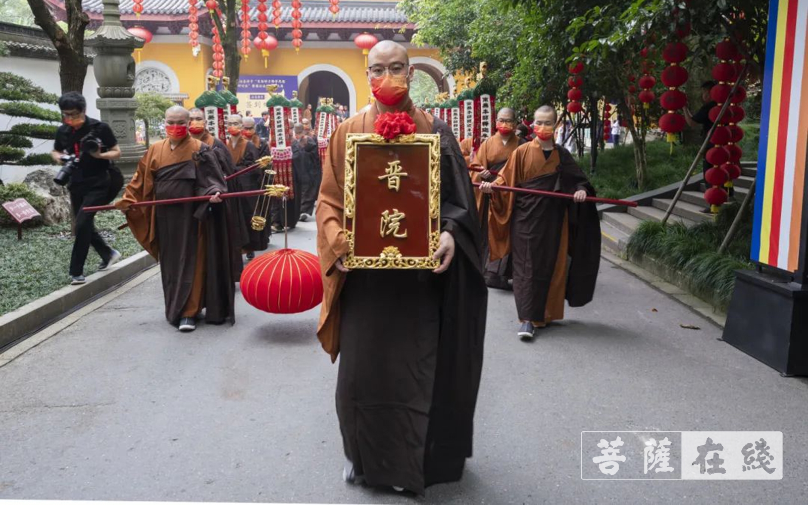 圆诠法师在山门前说法后,在晋院牌的引导下,在与会的高僧大德、诸山长老的簇拥下,手持如意,缓缓步入山门。